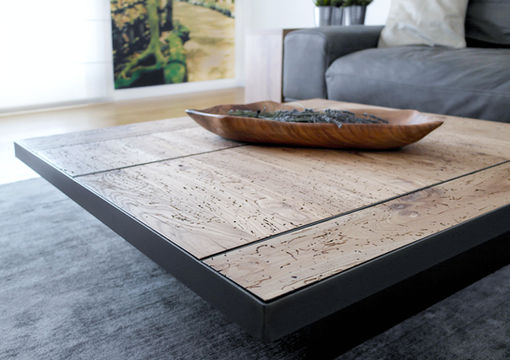 Tavolino da caffè in ferro ossidato e olmo tarlato.